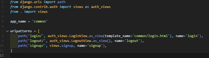 우선 common/urls.py에 views를 import하고 path를 지정합니다.