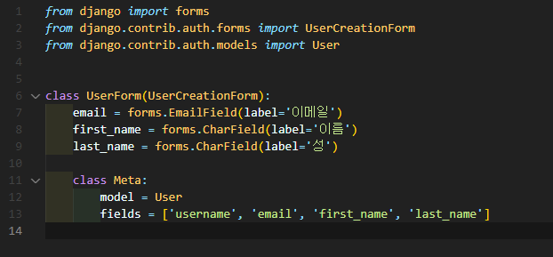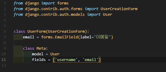 계정 정보를 담을 UserForm을 생성합니다. 경로는 common/forms.py에 작성하며 django에서 제공하는 UserCreationform을 상속 받아 이메일 필드를 추가하여 작성합니다.
