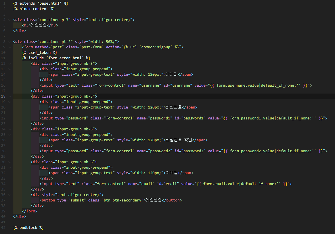 다음으로 templates/common/signup.html 파일을 생성하여 아래와 같이 작성합니다.