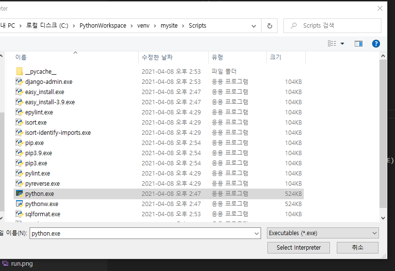 가상환경이 설치된 폴더 내 "/Scripts/python.exe" 파일을 선택한다.