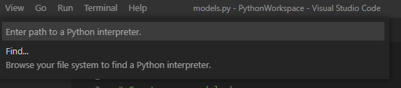 "Enter interpreter path..."를 클릭하고 "Find..."를 클릭한다.
