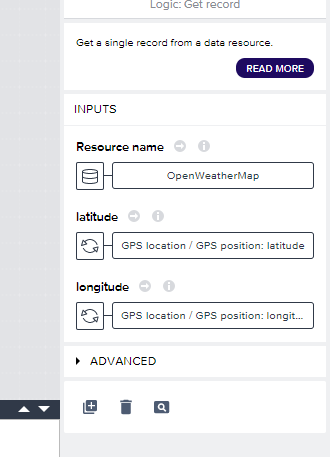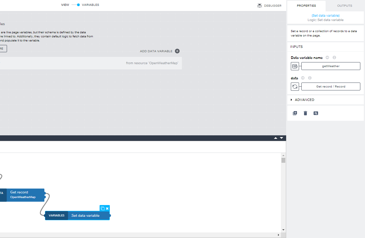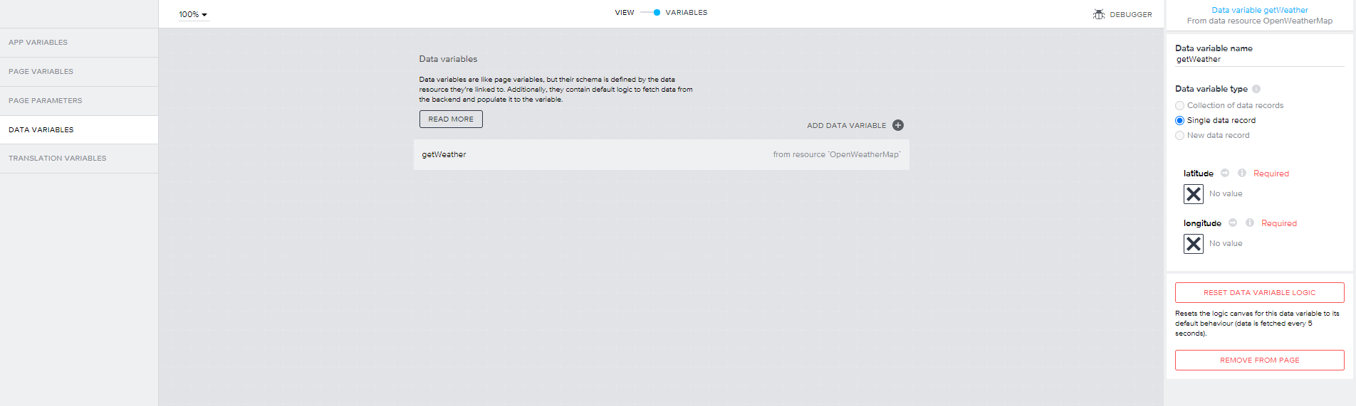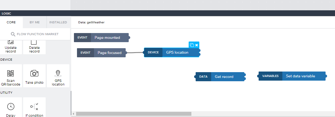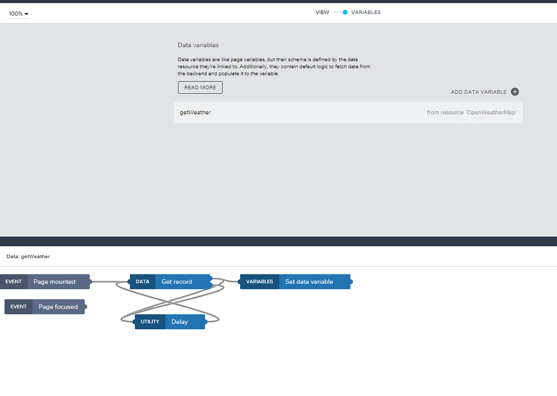하단 Show logic for~ 를 클릭합니다. 그러면 DATA VARIABLES에 대한 처리 로직이 표시됩니다. 이 로직은 이전 글에서도 설명했듯이 Fetch 작업 맞는 로직이라고 합니다. 따라서 변경이 필요한데 연결선을 모두 삭제하고 GET record, Set data variable만 남겨둡니다. 여기서는 GPS 좌표를 얻어 Get record를 통해 API 요청을 하고 응답값을 Set data variable를 통해 저장합니다. 연결선 삭제는 선을 선택하고 delete키를 누르면 됩니다.