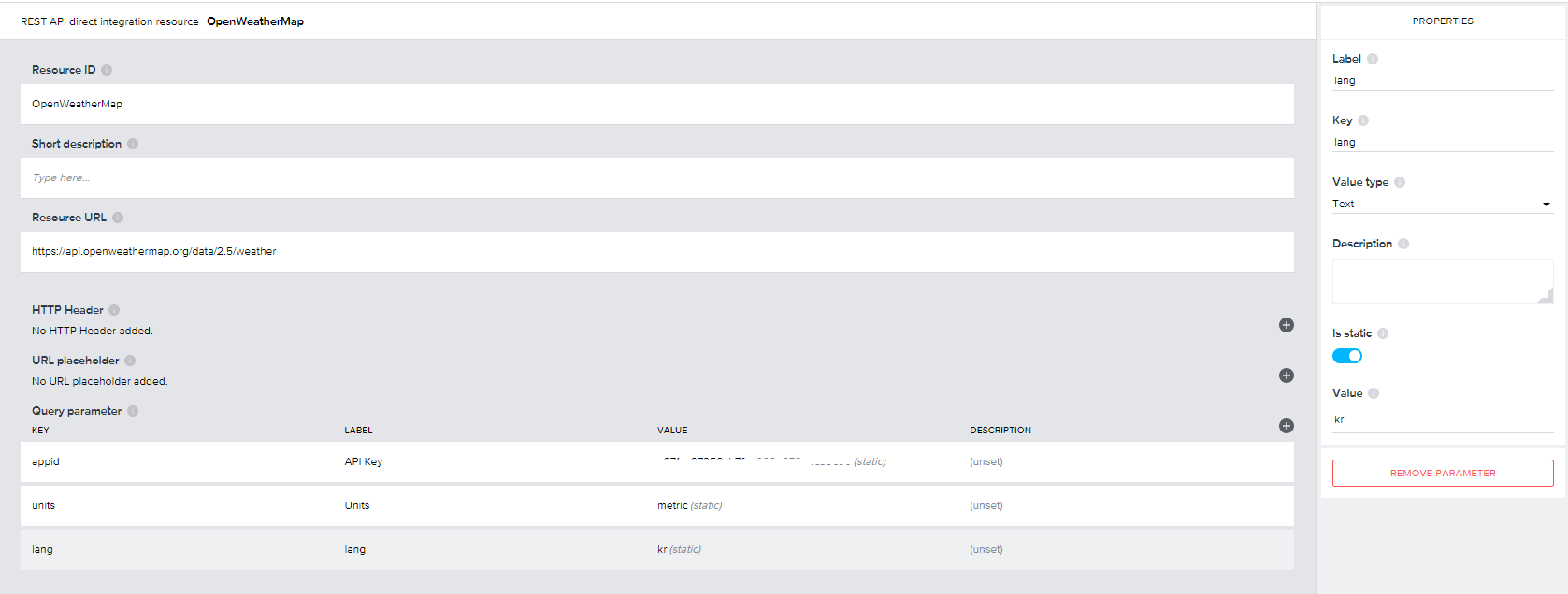 좌측 메뉴 중 BASE에서 아래 화면과 같이 Resource ID를 정의하고 기본 URL (https://api.openweathermap.org/data/2.5/weather) 에 파라미터는 3개 (appid=API KEY, units=metric, lang=kr)를 추가합니다. 파라미터값은 변동 없는 고정값이므로 static입니다.
