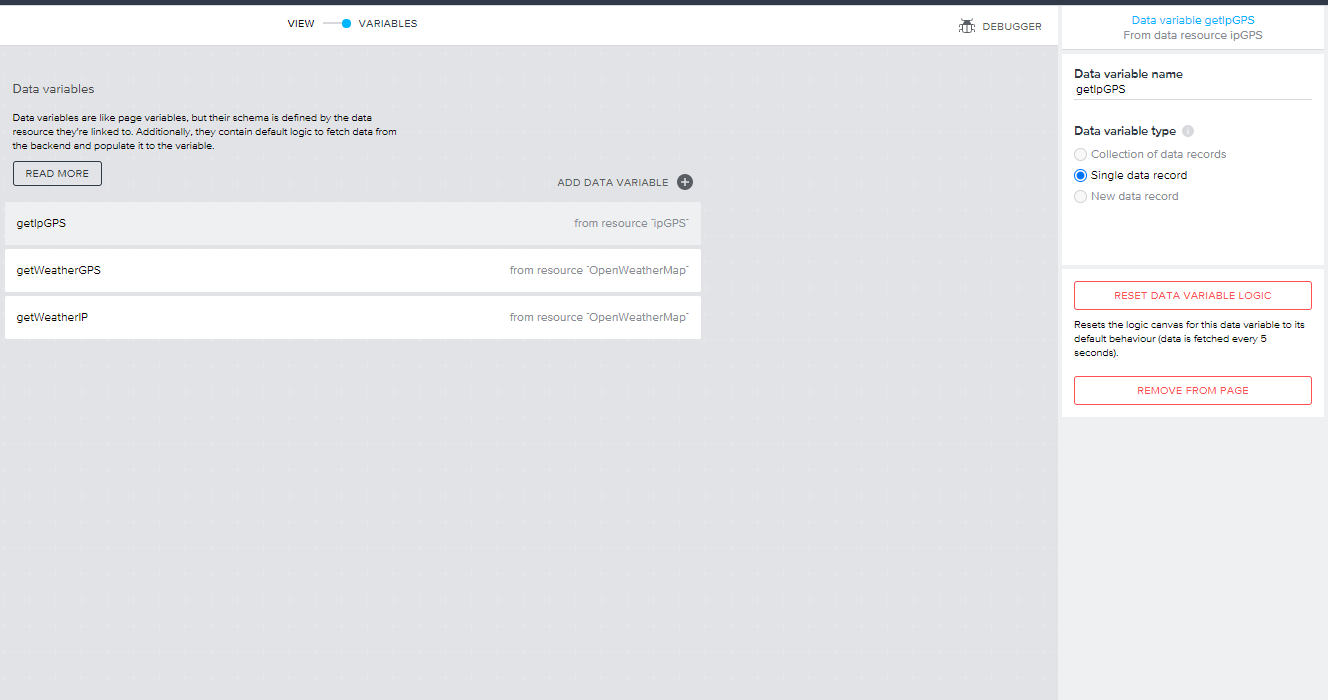 우측 ADD DATA VARIABLE을 클릭하여 변수를 하나 생성하고 Data variable type는 Single data record로 선택, GPS 좌표값은 위에서 설정한 getIpGPS에서 받는 좌표값을 넣습니다. 또한 NUMBER형 변수이므로 formula를 통해 형변환 합니다.