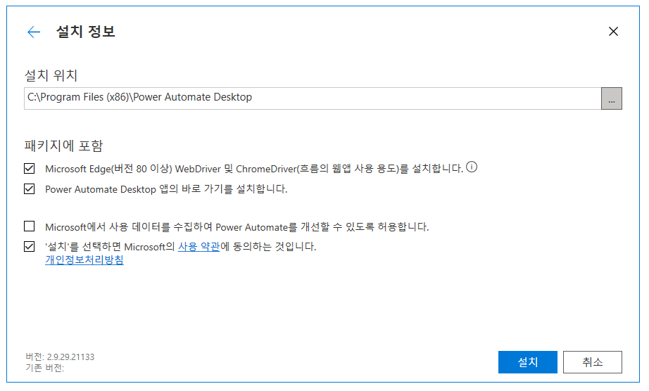 옵션은 그대로 두시고 하단 약관 동의 체크한 후 설치를 클릭합니다. (데이터 수집 허용은 해제하였습니다.)