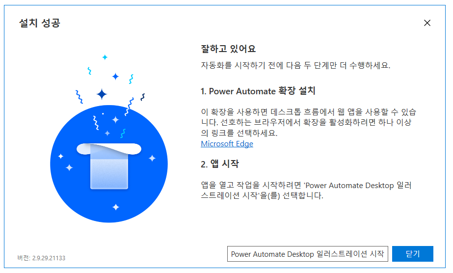 설치가 종료되고 웹 자동화를 위해 브라우저 확장팩을 설치해야 합니다. Edge 링크를 눌러 확장팩을 설치해줍니다.