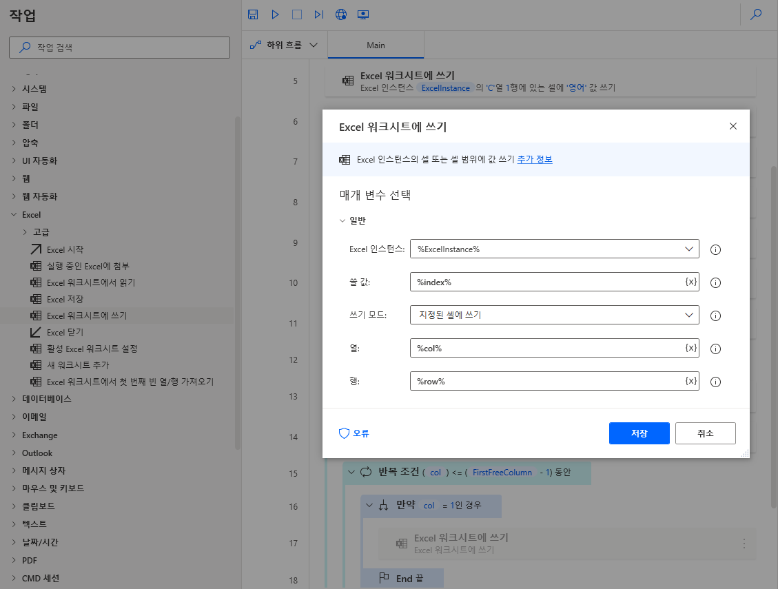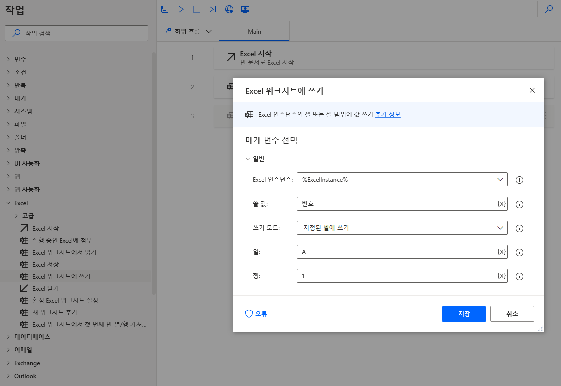 좌측 메뉴에서 Excel 워크시트에 쓰기를 선택에 끌어와 배치하고 쓸 값은 번호, 열은 A, 행은 1로 입력 후 저장을 클릭합니다. 열은 엑셀에 표기되는 A, B, C로 입력해도 되고 번호를 입력해도 됩니다. 즉 A==1, B==2 이렇게 생각하면 됩니다.