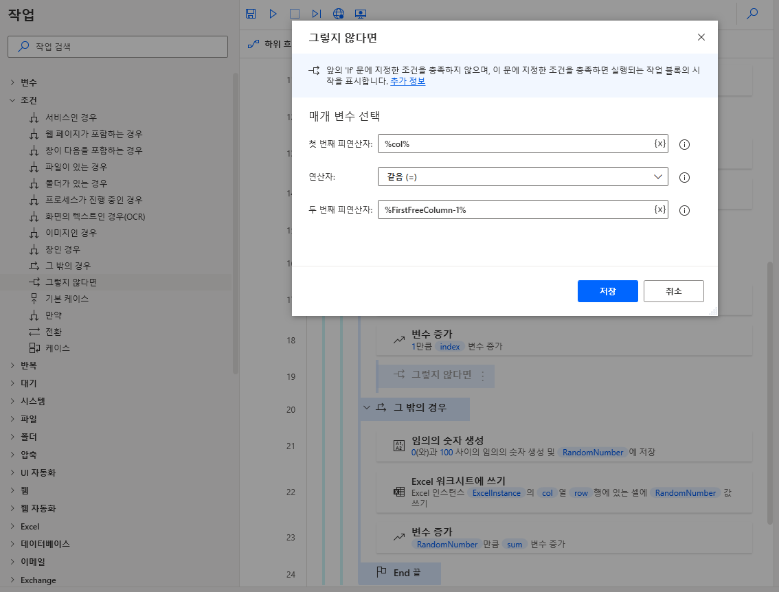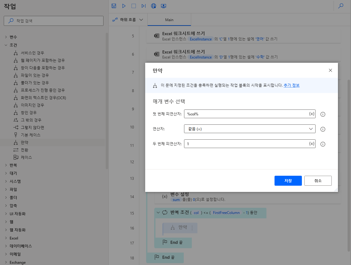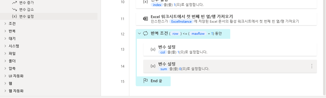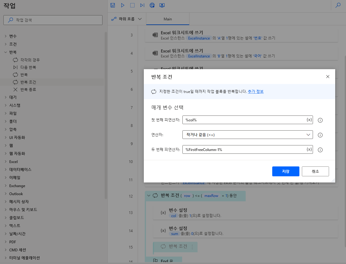 좌측 반복 > 반복 조건을 끌어와 sum 변수설정 값 하단에 위치합니다. 그리고 첫 번째 피연산자에 col변수, 연산자는 작거나 같음, 두 번째 연산자는 마지막 빈 열 (FirstFreeColumn) - 1 값을 입력하고 저장합니다.