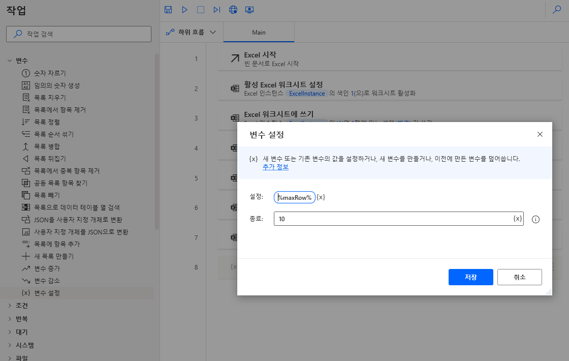 좌측 메뉴 중 변수 > 변수설정을 가져와 배치하고 변수 이름은 maxRow, 값은 10으로 입력합니다. 이는 총 10번의 행(row)만큼 반복을 위해 선언하는 변수입니다. 설정의 값을 클릭하면 변경할 수 있는 필드로 바뀌는데 %를 제외한 가운데 문자 부분을 maxRow로 변경해주고 종료값에는 10을 입력하고 저장합니다.
