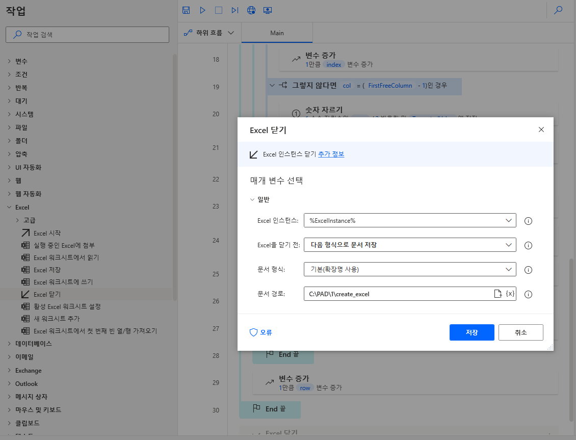 이제 파일을 저장하고 엑셀을 종료하겠습니다. Excel > Excel 닫기를 끌어와 최 하단에 배치하고 파일명 및 경로를 지정하고 저장합니다.