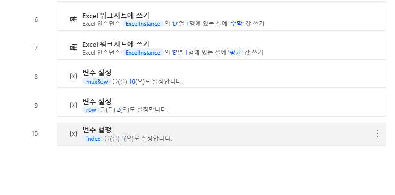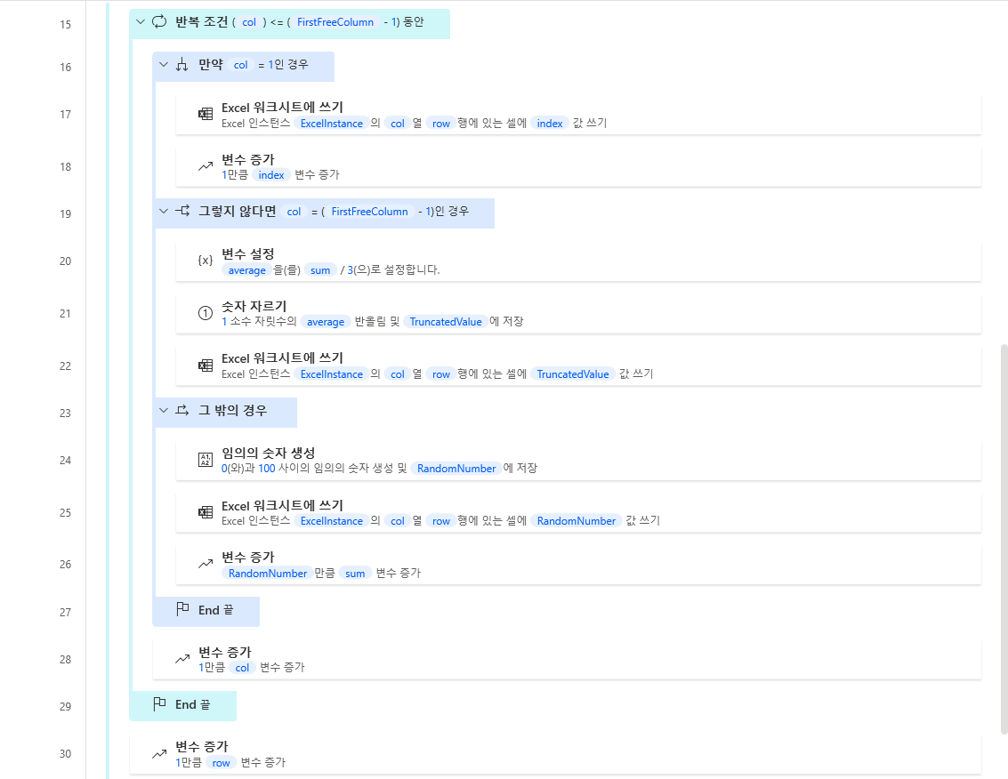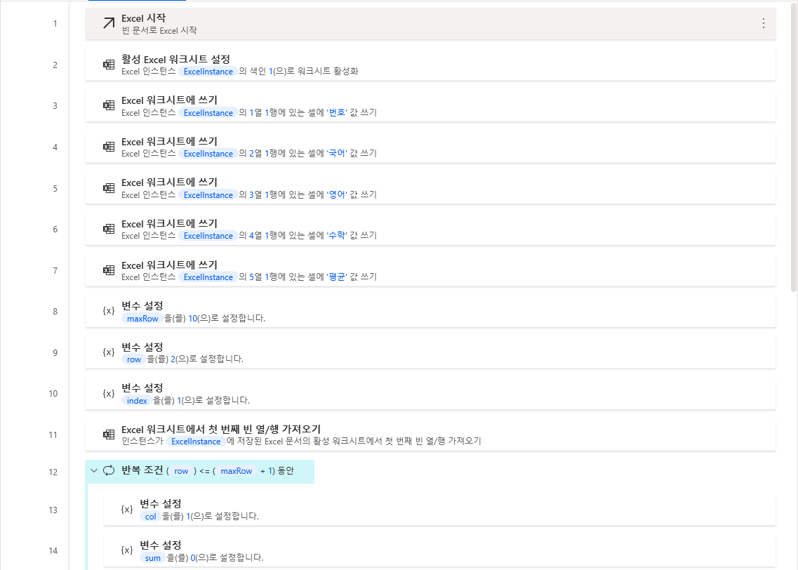 우선 좌측 변수 > 변수 설정을 끌어와 반복 조건 안쪽에 배치하고 col, sum 변수를 정의합니다. col 변수는 번호 열부터 평균 열까지 반복 되는 값이 저장될 변수이고 sum 변수는 국어, 영어, 수학 점수를 모두 합한 값을 넣을 변수입니다.