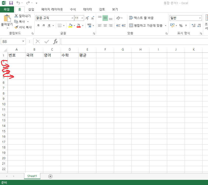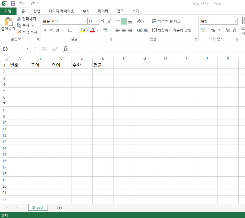다음은 문서의 타이틀 (번호, 국어, 영어, 수학, 평균)을 입력하겠습니다. 이 값들은 한번만 입력하는 static 값이라서 바로 셀에 값 지정해서 넣겠습니다.