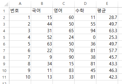 6. A2셀에는 번호, B2셀에는 무작위 국어 점수, B3셀에는 무작위 영어 점수 ~ E1셀에는 앞에 3개 값 평균 입력