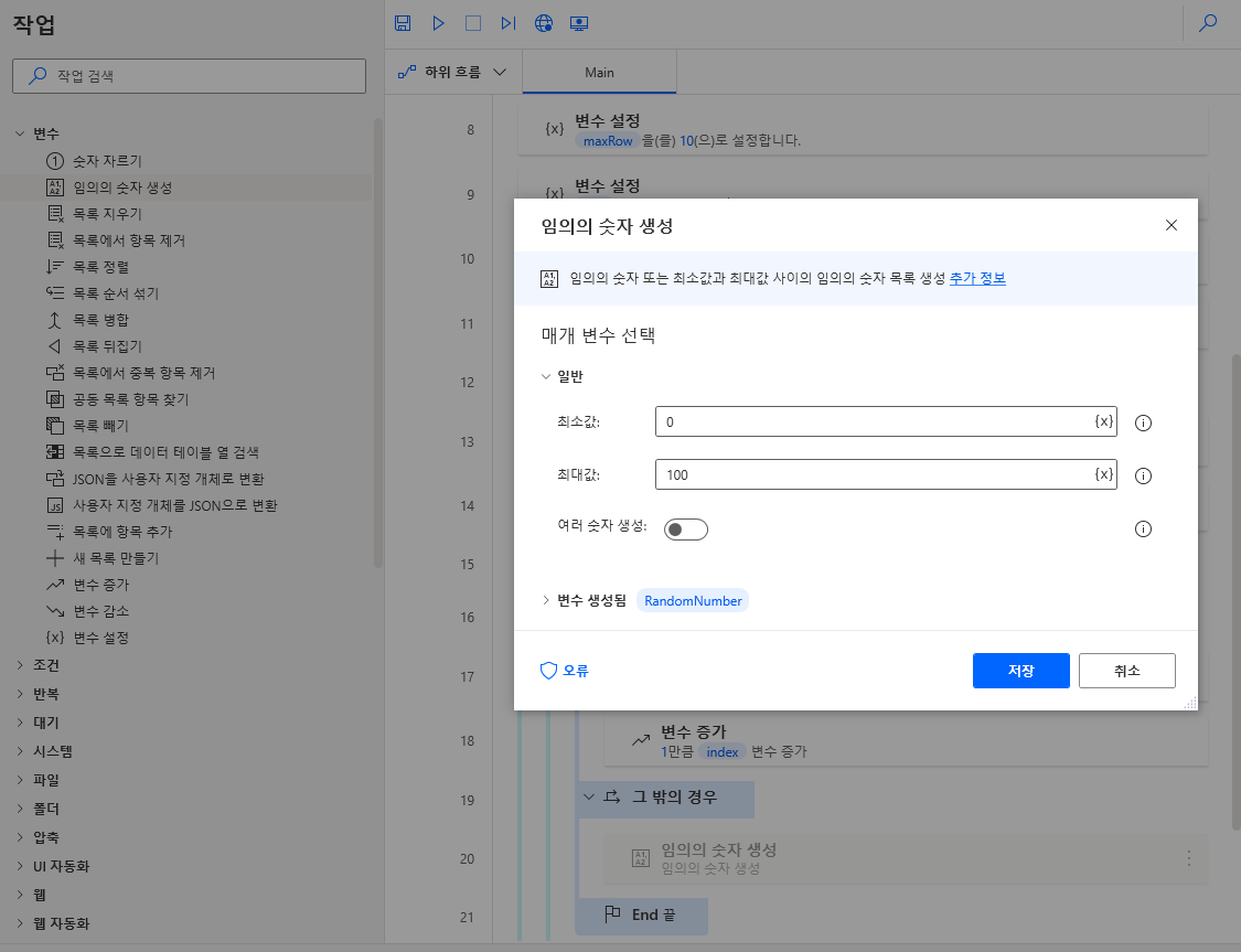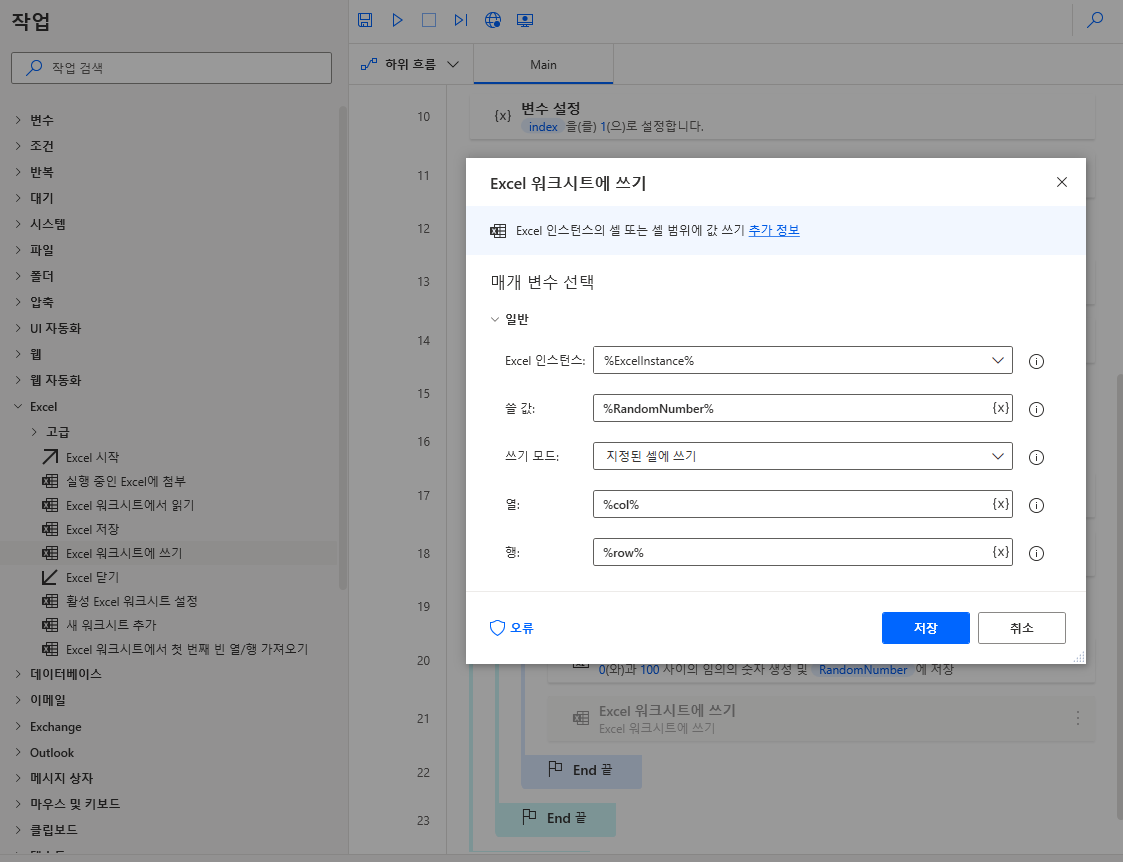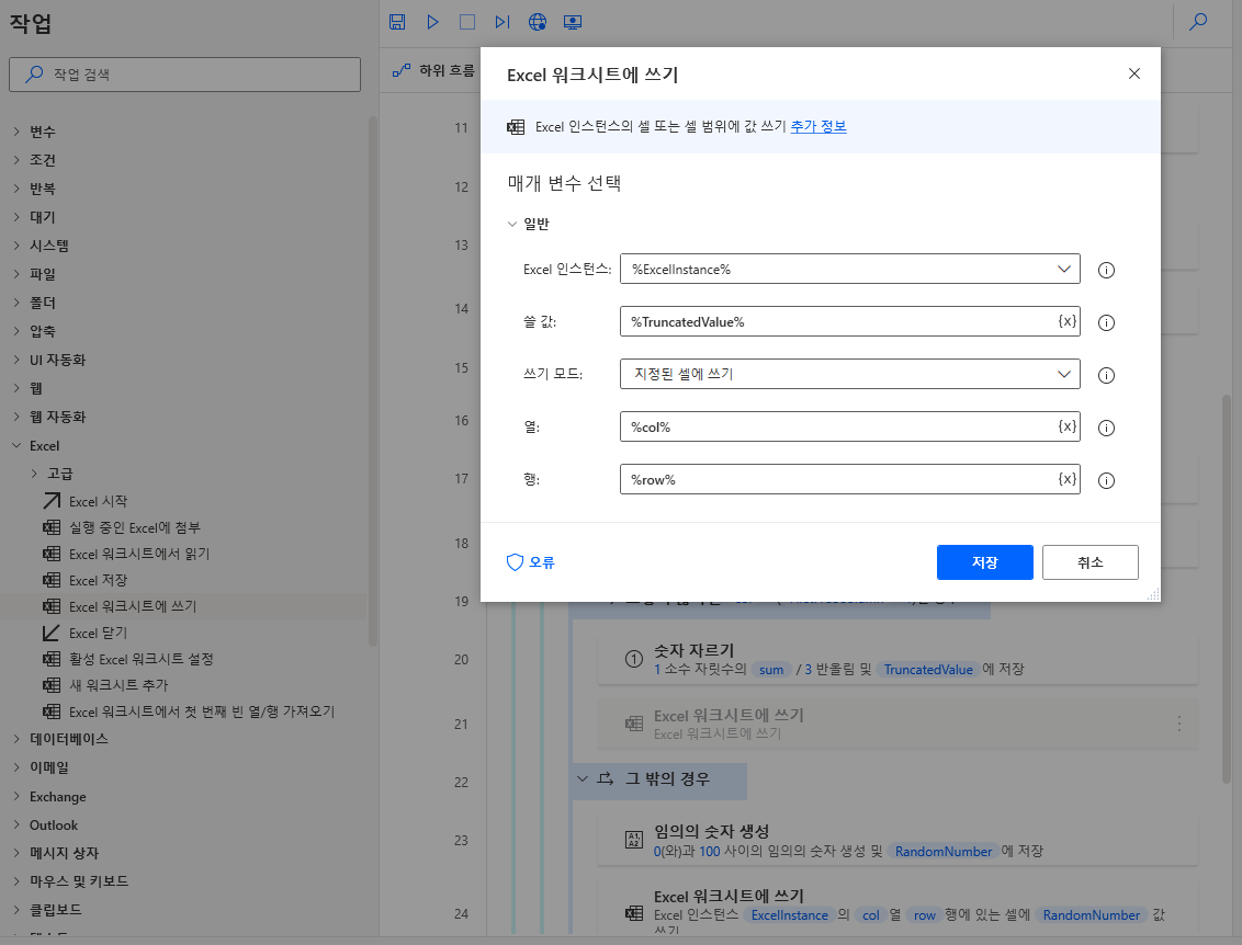 이제 나머지 열(column)에 해당 값을 넣겠습니다. 좌측 Excel > Excel 워크시트에 쓰기를 끌어와 임의의 숫자 생성 하단에 위치하고 아래와 같이 변수를 정의하고 저장합니다.