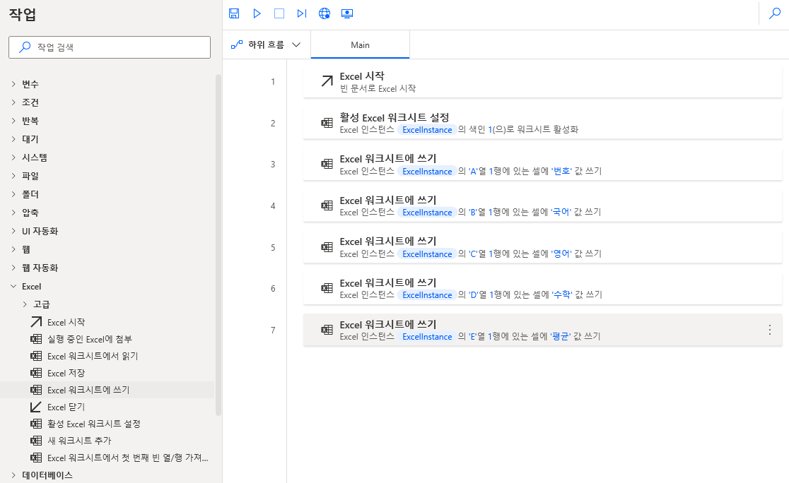 이번 RPA 목표는 엑셀 파일을 생성해서 총 10명 학생의 국어, 영어, 수학 점수를 100점 만점 기준으로 무작위 입력한 다음 평균(소수점 1자리 반올림)을 구하고 파일 저장 후 프로그램 종료하는 내용입니다.