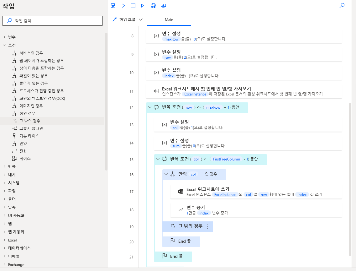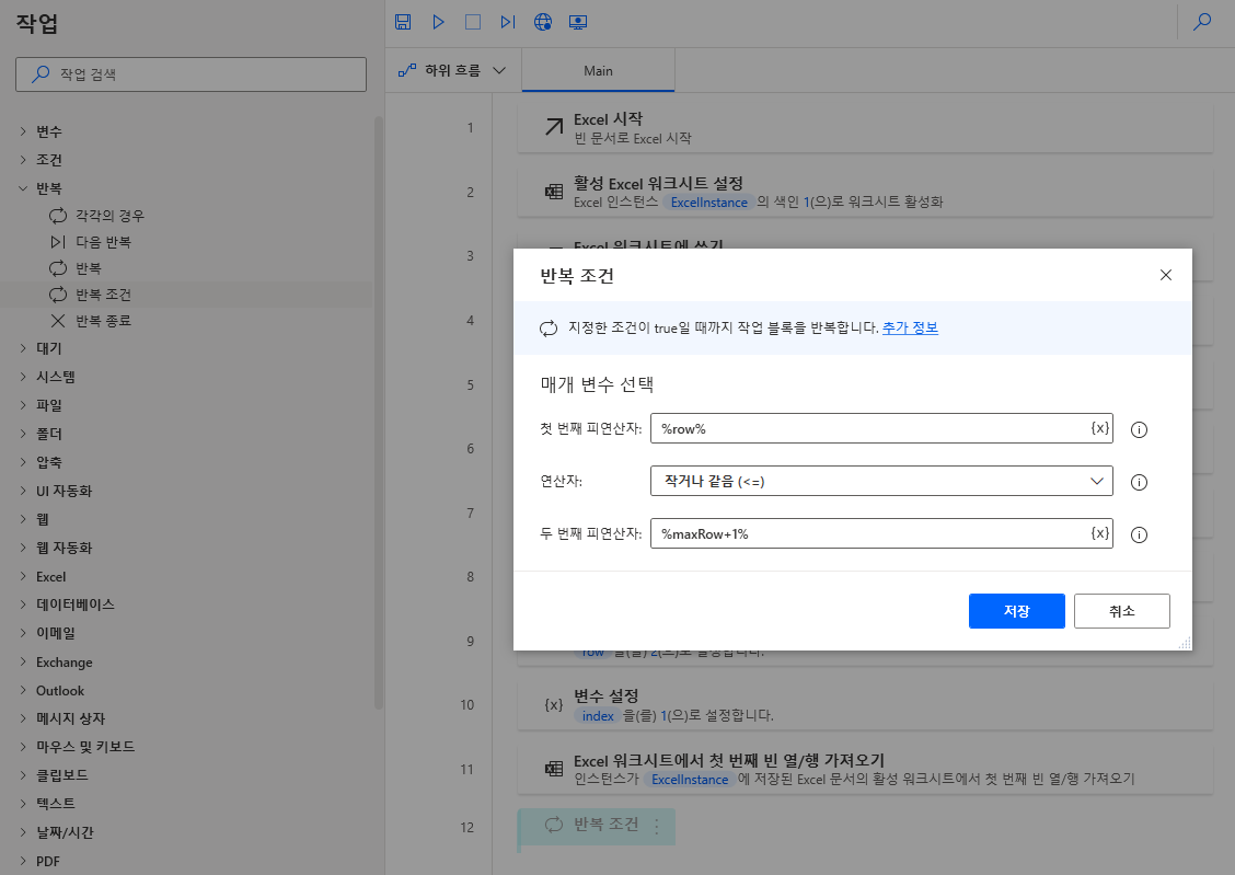 좌측 반복 > 반복 조건을 끌어와 배치하고 첫번째 피연산자는 row, 연산자는 작거나 같음 (<=), 두 번재 피연산자는 maxRow+1를 지정하고 저장합니다.