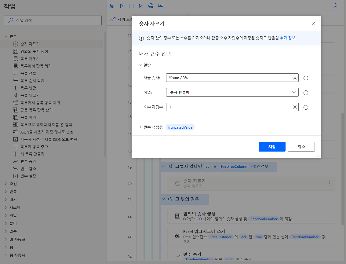 세 과목을 모두 합한 sum 변수를 3으로 나눠 반올림하여 소수점 한자리로 표시하겠습니다. 좌측 변수 > 숫자 자르기를 그렇지 않다면 사이에 끌어와 아래와 같이 입력하고 저장합니다.