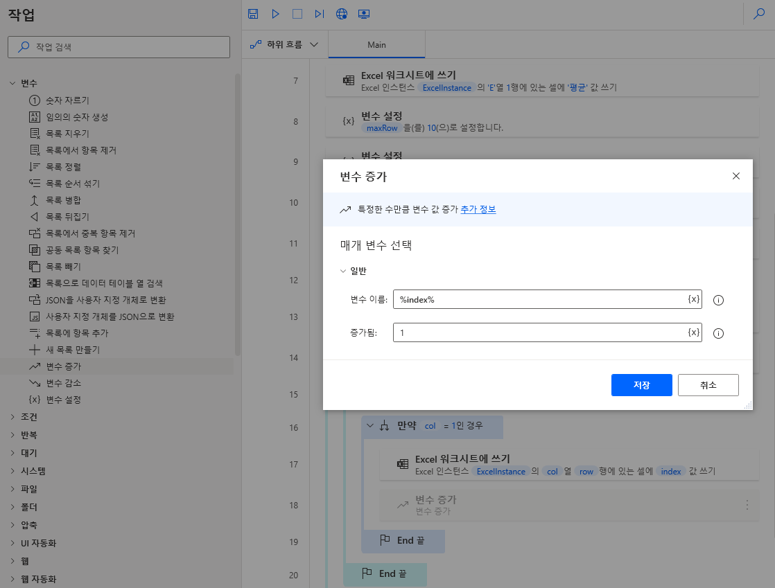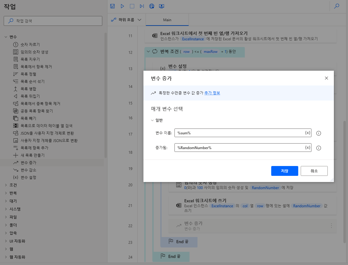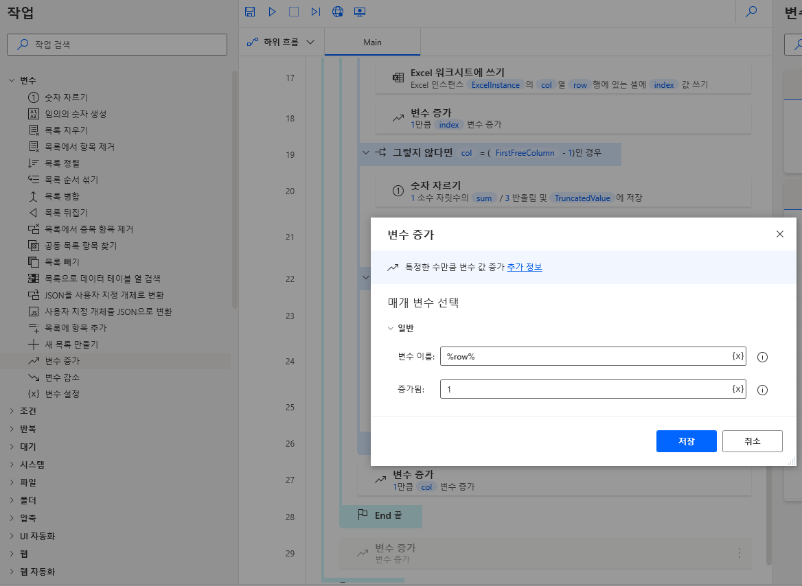 이제 다음 행(row)로 가도록 변수 > 변수 증가를 끌어와 row 반복문 끝에 추가하고 아래와 같이 입력하여 저장합니다.