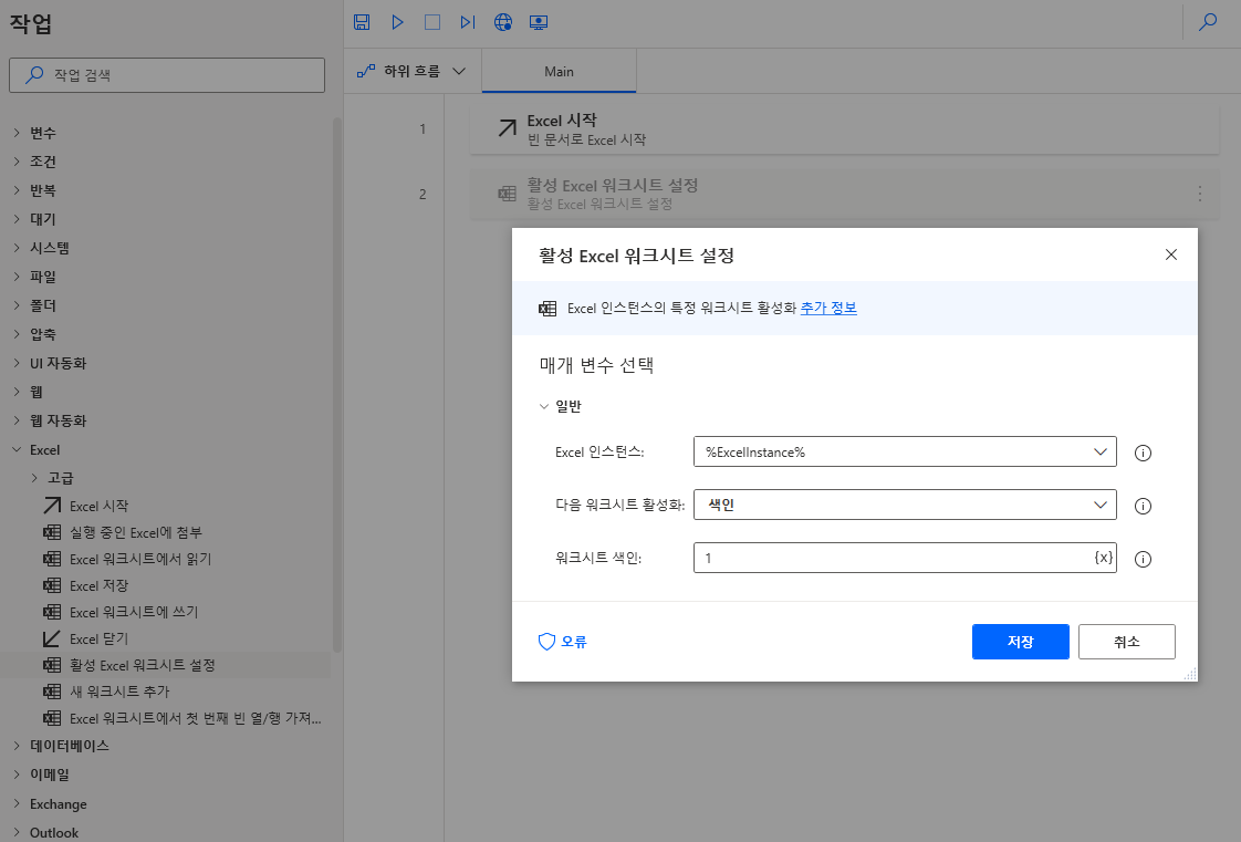 좌측 메뉴 중 활성 Excel 워크시트 설정을 끌어와 배치하고 다음 워크시트 활성화는 색인으로, 워크시트 색인은 1번으로 입력하고 저장합니다.