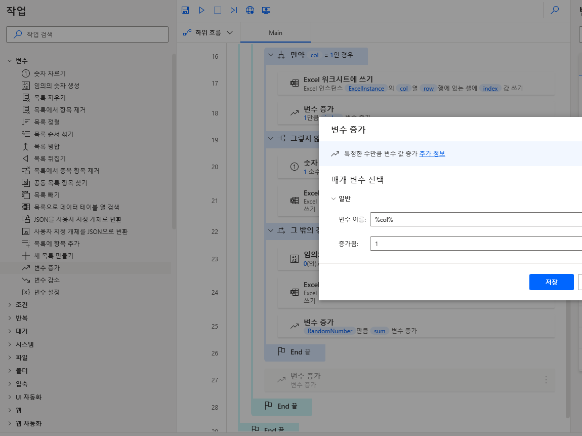 좌측 변수 > 변수 증가을 끌어와 아래 그림처럼 만약 col = 1인 경우 마지막 구문에 위치하고 아래와 같이 입력합니다.