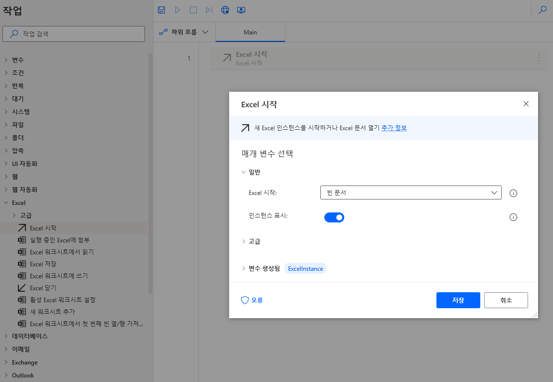 다음 좌측 화면의 Excel > Excel 시작을 끌어와 배치합니다. 화면을 보면 변수 생성됨에 ExcelInstance라는 이름이 정의된 것을 볼 수 있습니다. 이는 새로 생성한 엑셀문서가 해당 변수의 이름으로 저장된다라는 뜻으로 다른 작업을 할 경우 이 변수명을 지정해줘야 합니다. 변수명을 클릭해서 변경도 가능하며 우측 흐름 변수에도 표시되는 것을 확인할 수 있습니다.