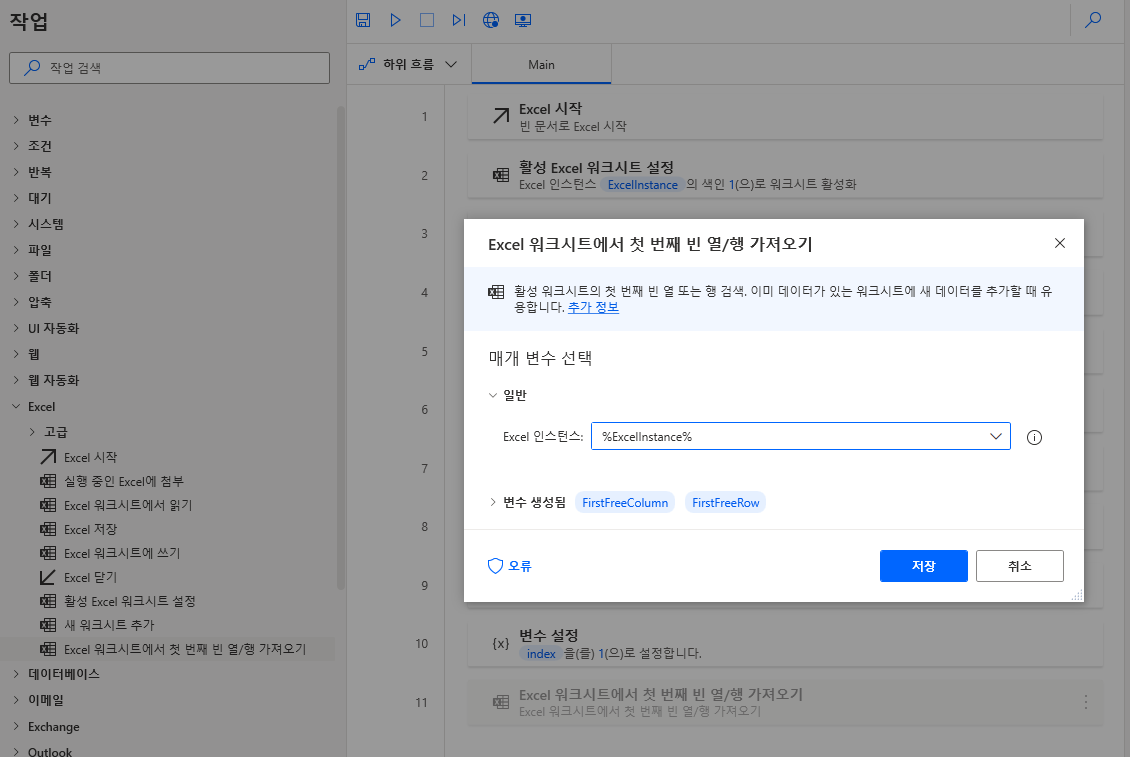 다음으로 좌측 메뉴 Excel > Excel 워크시트에서 첫 번째 빈 열/행 가져오기를 끌어와 배치한 후 저장을 클릭합니다. 이는 열(column) 계산 시 마지막 열의 값을 구하기 위한 변수(FirstFreeColumn - 1)입니다. (첫 번째 나오는 빈열 - 1 = 평균값이 들어가는 열)