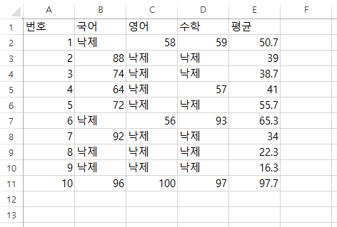 평균을 제외한 국영수 점수 중 50점 미만인 셀에 점수 대신 "낙제"라는 단어로 수정하고 싶습니다.