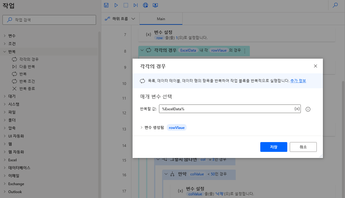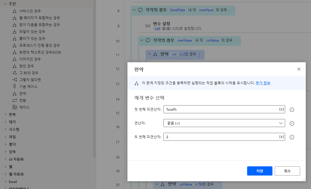 이제 열 정보를 가져올 반복문이 필요합니다. 좌측 메뉴 반복 > 각각의 경우를 끌어와 10번에 위치하고 반복할 값은 rowValue, 저장될 변수는 colValue로 저장합니다. 위에서 데이터 테이블 형태로 정의한 ExcelData는 2차원 배열로 처음에는 행 수에 맞게 정보가 나열되고 다음으로 각 행 정보에 열 정보가 들어가 있는 형태로 구성되어 있습니다.