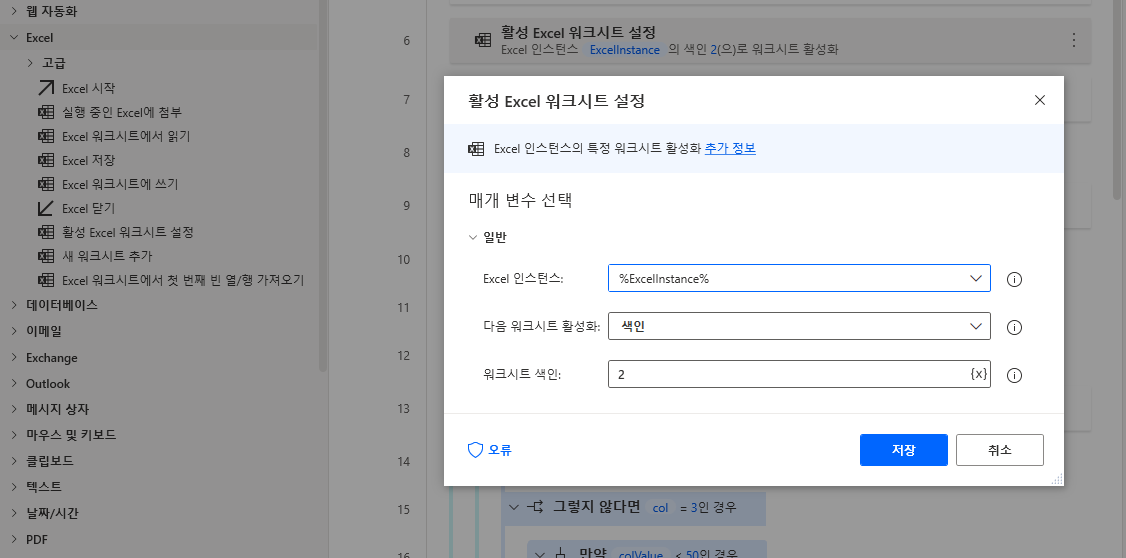 다음으로 좌측 메뉴 Excel > 활성 Excel 워크시트 설정을 끌어오고 다음 워크시트 활성화는 색인을 선택, 워크시트 색인은 1을 입력하고 저장합니다. 만약 작업 대상 시트가 다른 곳에 있다면 해당 번호를 넣어주면 됩니다. (파일의 두번째 시트에 있다면 2)