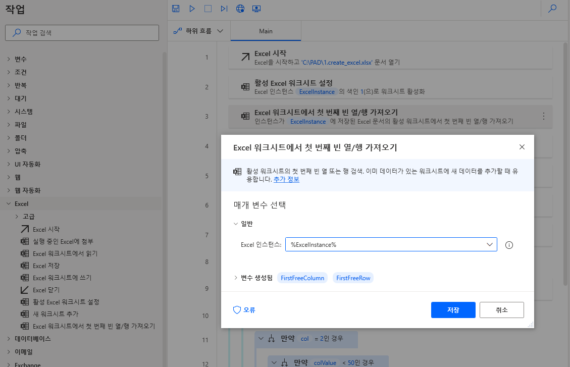 좌측 메뉴 Excel > Excel 워크시트에서 첫 번째 빈 열/행 가져오기를 끌어오고 저장합니다. 이는 시트에 있는 셀 데이터를 읽을 때 데이터가 있는 마지막 행과 열을 구하기 위해 미리 변수로 지정해둡니다. 이렇게 하면 FirstFreeColumn 변수에는 현재 시트에서 빈 열이 처음 있는 번호 (데이터가 있는 마지막 열 번호 + 1)를 저장하게 됩니다.