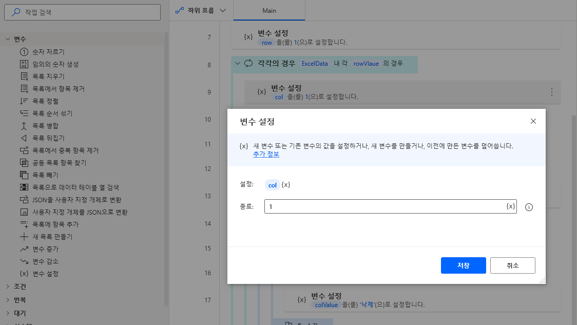 좌측 변수 > 변수 설정을 끌어와 9번 (작업 흐름창 번호)에 위치시키고 변수명은 col, 값은 1을 넣고 저장합니다. 이는 데이터를 넣을 셀 좌표값 중 열 값으로 하단 반복문이 종료될 때 +1씩 증가시켜 줘야 합니다.