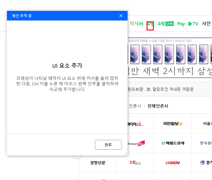 네이버 페이지 상단 메뉴 중 쇼핑 메뉴에서 ctrl을 누른 후 마우스 클릭하여 UI 요소 추가 후 완료합니다.