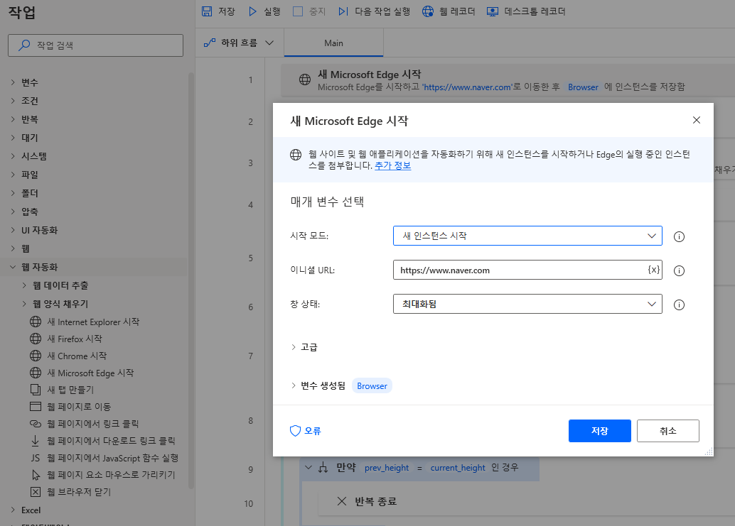 우선 페이지를 열어 네이버로 이동합니다. 좌측 메뉴 웹 자동화 > 새 Microsoft Edge 시작을 끌어와 URL은 네이버, 창 상태는 편하게 보기 위해 최대화를 선택하고 저장합니다.