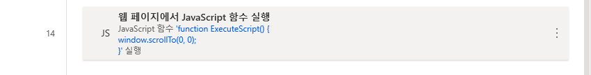 스크롤을 현재 페이지 기준 제일 아래로 내리겠습니다. 좌측 메뉴 웹 자동화 > 웹 페이지에서 JavaScript함수 실행을 끌어와 아래와 같이 입력하고 저장합니다. 함수 내 구문이 현재 페이지 하단까지 스크롤을 내리는 내용입니다.