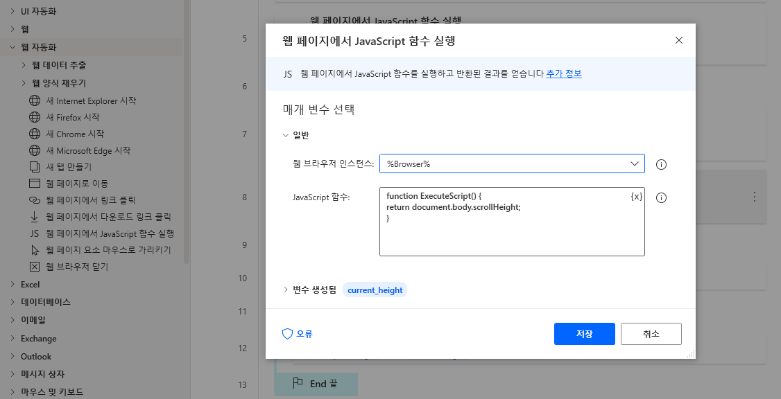 스크롤을 내린 현재의 페이지 높이를 구해야 합니다. 좌측 메뉴 웹 자동화 > 웹 페이지에서 JavaScript함수 실행을 끌어와 아래와 같이 입력합니다. 변수명은 current_height도 저장합니다.