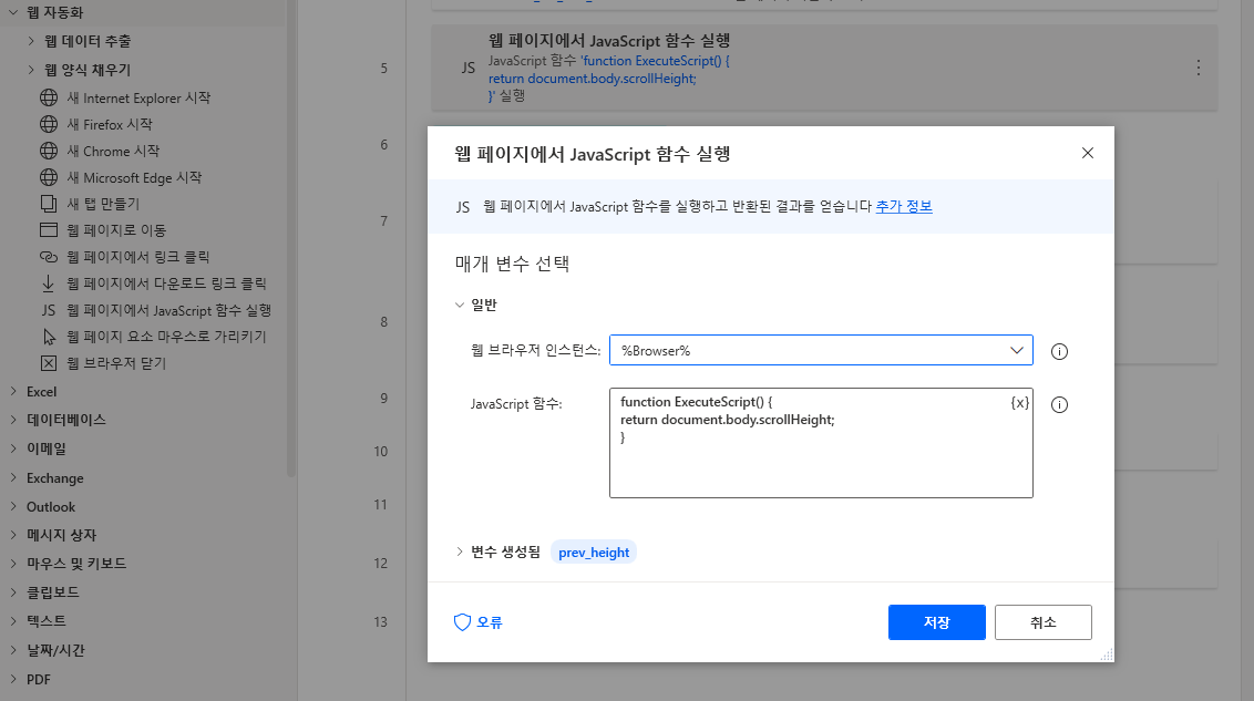 PAD에는 마우스 스크롤에 대한 작업이 없습니다. 그래서 Javascript를 이용해서 스크롤을 내려야 합니다. 좌측 메뉴 웹 자동화 > 웹 페이지에서 JavaScript 함수 실행을 끌어와 JavaScript 함수 부분에 아래와 같이 추가합니다. 그리고 변수명을 prev_height로 정의합니다.