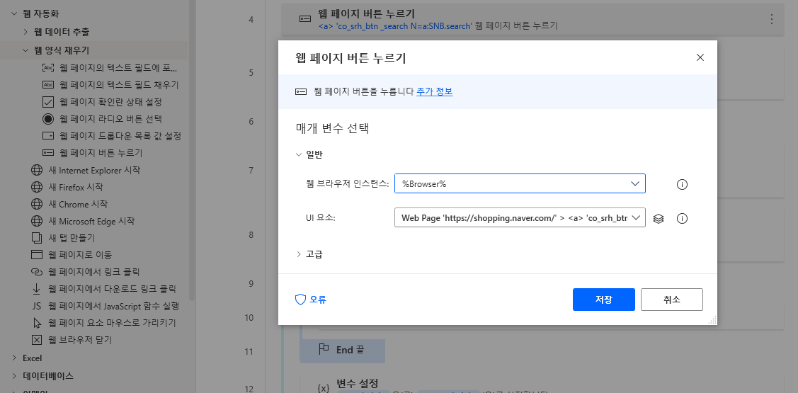 다음으로 검색 버튼을 클릭해야 합니다. 좌측 메뉴 웹 자동화 > 웹 양식 채우기 > 웹 페이지 버튼 누르기를 끌어와 검색 버튼 UI요소를 추가하고 저장합니다.