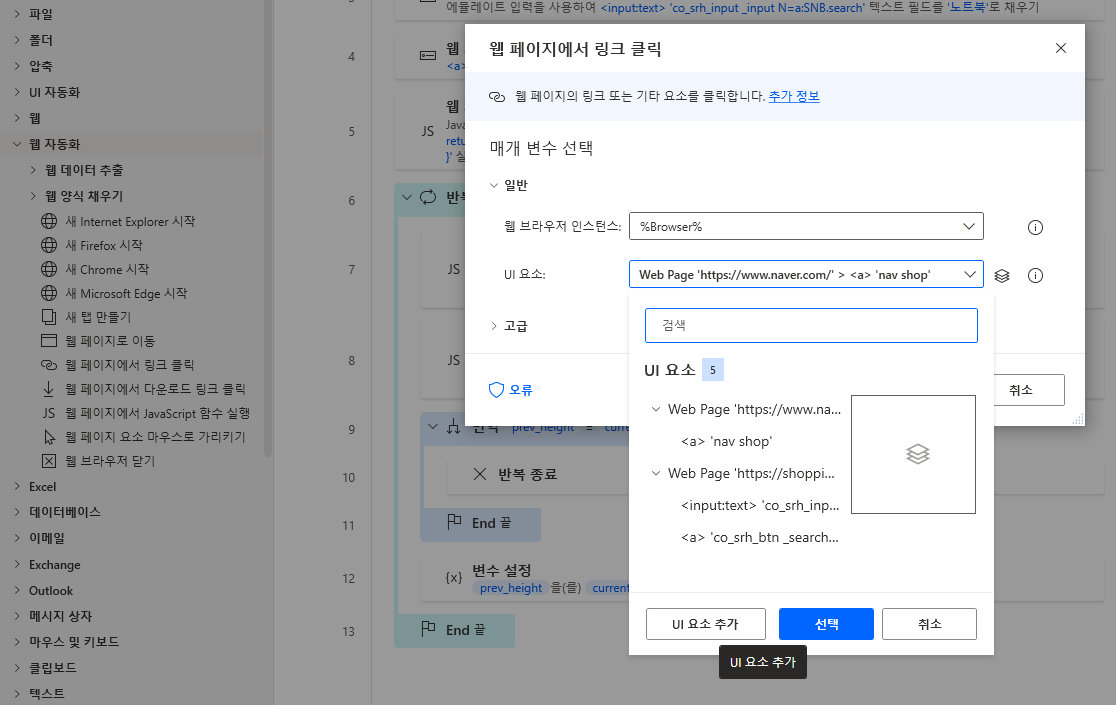 쇼핑 링크 값을 가져와야 합니다. 좌측 메뉴 웹 자동화 > 웹 페이지에서 링크 클릭을 끌어와 UI요소 드롭다운을 클릭한 다음 UI요소 추가를 클릭합니다.