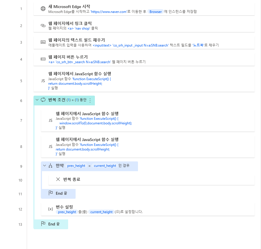 페이지를 호출하는 것은 PAD에 있는데 그 다음 스크롤을 내리는 작업에 대한 작업은 없고 또한 스크롤을 내리다가 맨 끝이 어딘지 알 수 있는 방법이 없습니다.