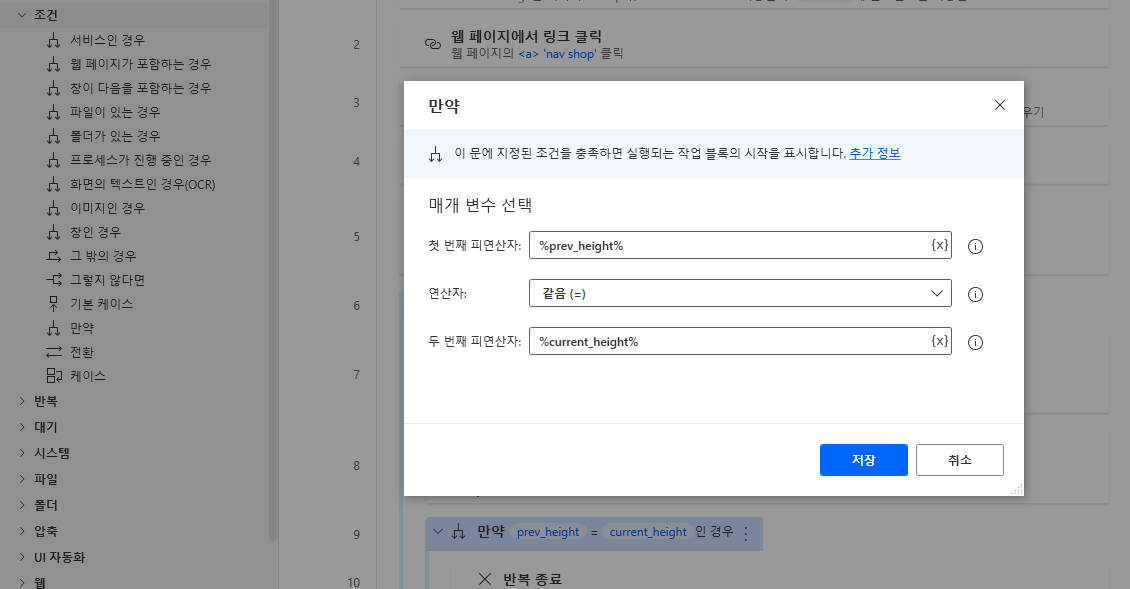 이제 스크롤을 내리기 이전 높이와 스크롤을 내린 높이를 비교합니다. 좌측 메뉴 조건 > 만약을 끌어와 아래와 같이 입력하고 저장합니다.