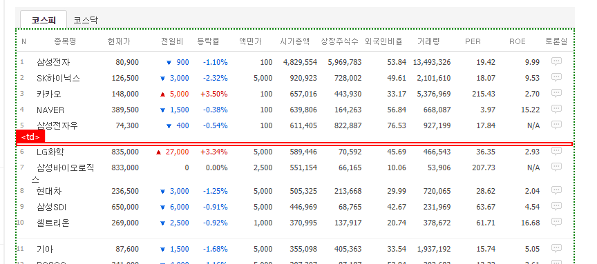 이제 상단 실행 버튼을 눌러 시가총액 순위 페이지의 구성을 살펴보겠습니다. 상단 옵션은 원하는 값을 지정할 수 있고 여기서는 단순 테스트이니 기본 표시되는 정보로 진행하겠습니다. 총 13개의 열이 있는데 그 중 맨 마지막 토론실은 의미 없으므로 추출하지 않겠습니다.