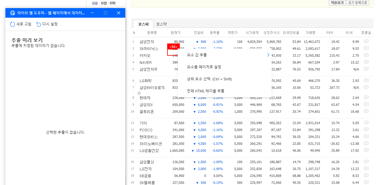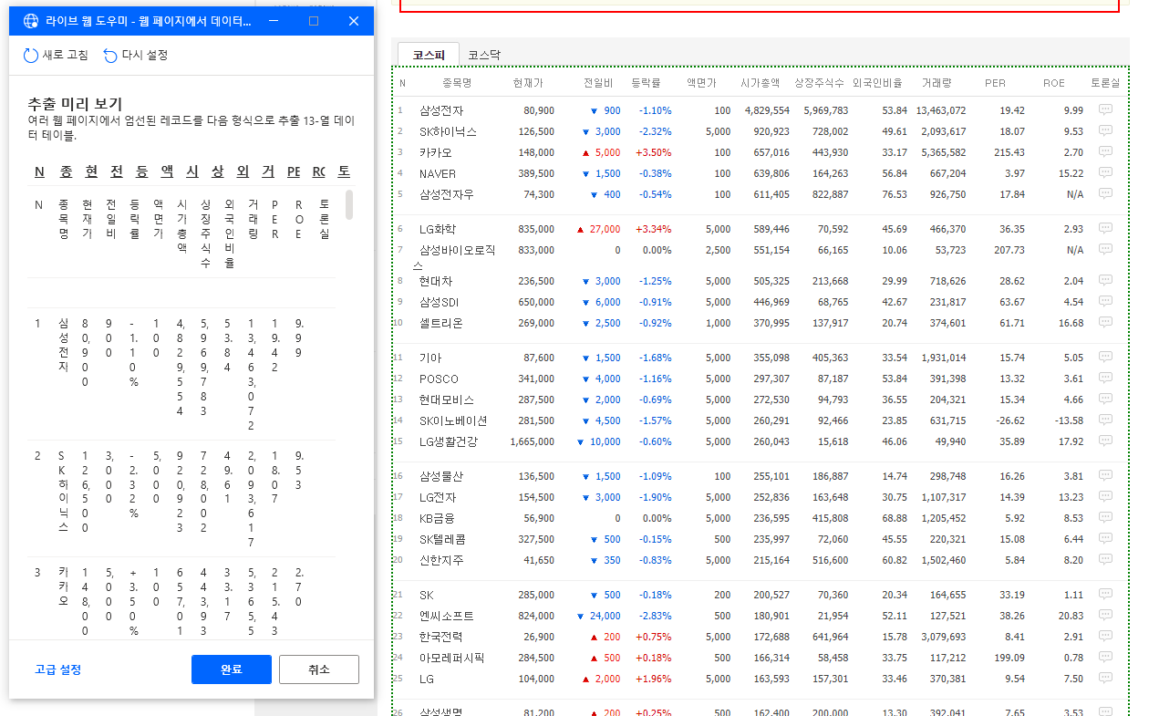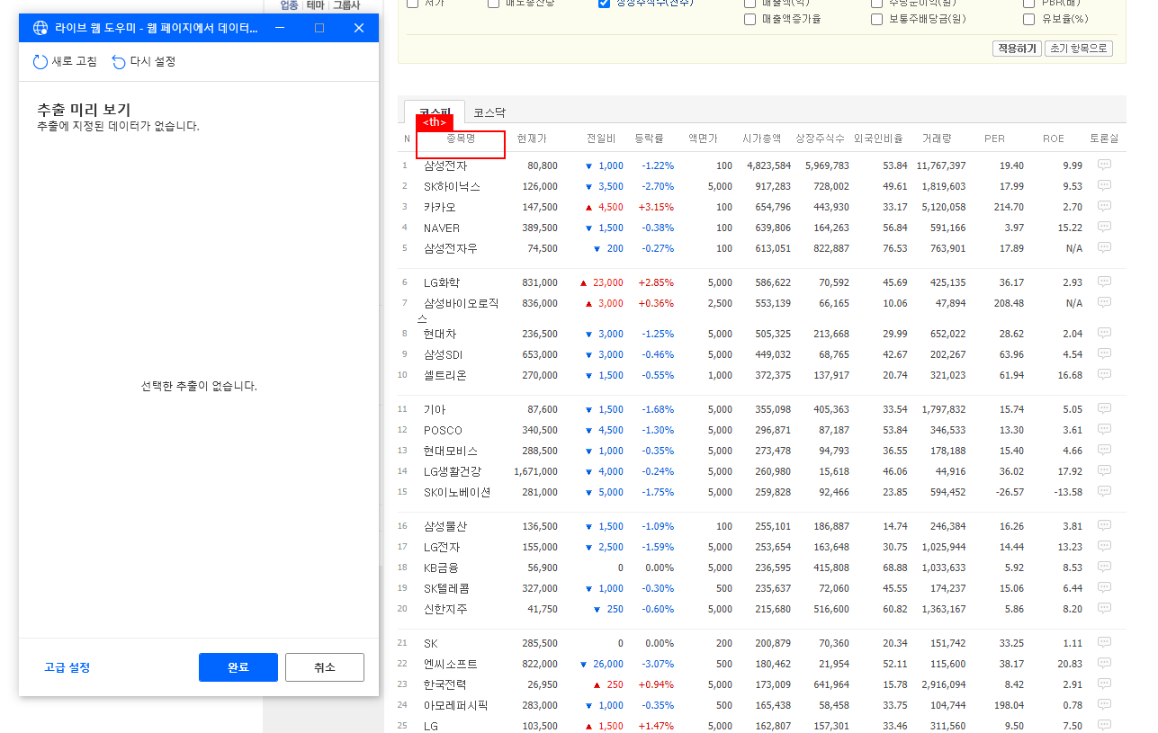 그렇게 되면 초록색 점선으로 시가총액 순위 정보가 표시된 표가 선택되고 라이브 웹 도우미 창에도 해당 데이터가 표시되는 것을 확인할 수 있습니다.