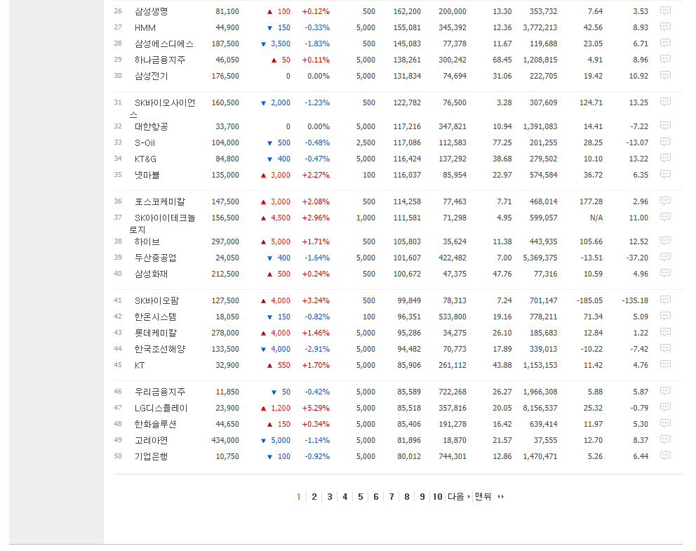 시가총액 순위는 네이버에서 시가총액 순위라고 검색하면 위 URL을 확인할 수 있습니다.