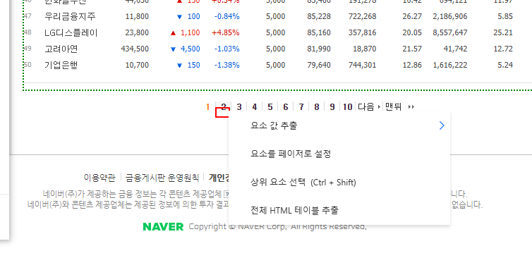 이제 웹 페이지의 데이터가 있는 부분에 마우스 커서를 가져가 우측 버튼을 클릭하면 아래 그림과 같은 팝업 메뉴가 표시됩니다.