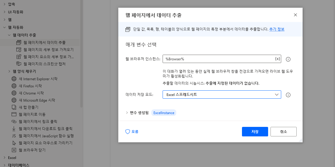 (브라우저는 닫지 마세요) 다시 작업창으로 돌아와 웹 자동화 > 웹 데이터 추출 > 웹 페이지에서 데이터 추출을 끌어와 데이터 저장 모드를 Excel 스프레드시트로 선택합니다. (저장 누르지 마세요)