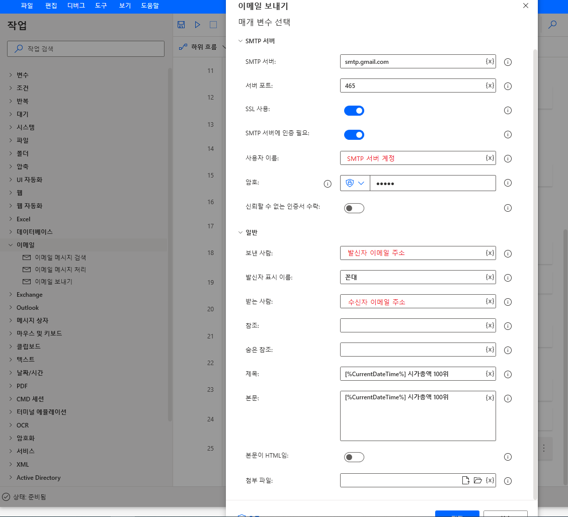 이제 이메일 정보 설정을 위해 좌측 메뉴 이메일 > 이메일 보내기를 끌어와 아래와 같이 입력합니다. 제목과 본문에 보면 위에서 정의한 현재날짜를 변수명으로 입력하였습니다. 또한 하단에 첨부파일을 추가하여 위에서 생성한 시가총액 엑셀파일을 첨부하면 됩니다.