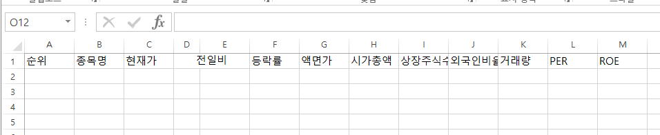 타이틀을 따로 만들어서 저장하는 이유는 타이틀 부분을 요소 추출하면 위 그림처럼 13행 1열의 형태로 추출이 되어야 하는데 반대로 1행 13열 형태로 추출이 됩니다. 바꾸려도 해도 방법도 없고 추출된 것을 수정도 불가능해 데이터를 넣을 엑셀을 별도로 만들고 타이틀을 미리 집어 넣었습니다.