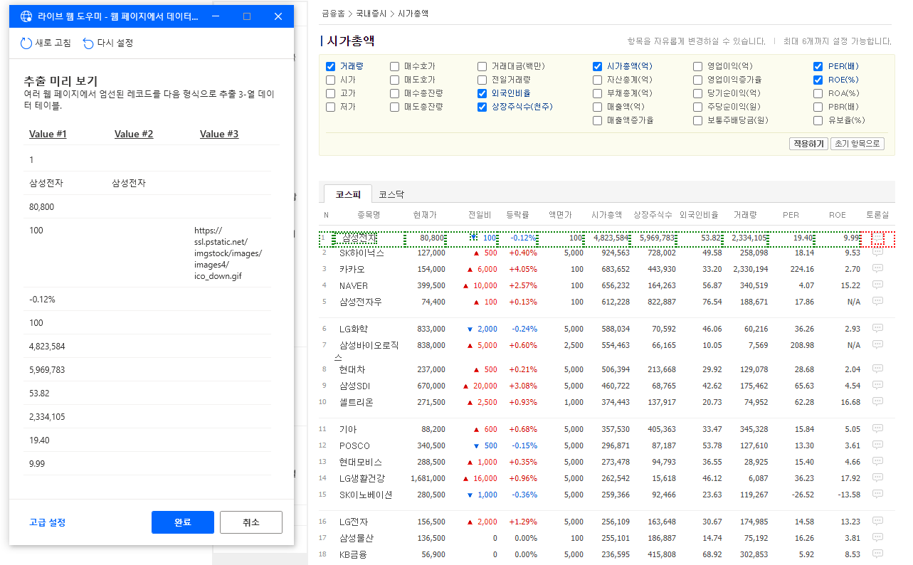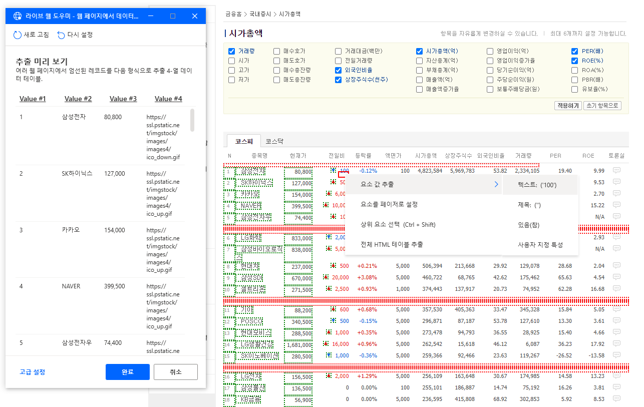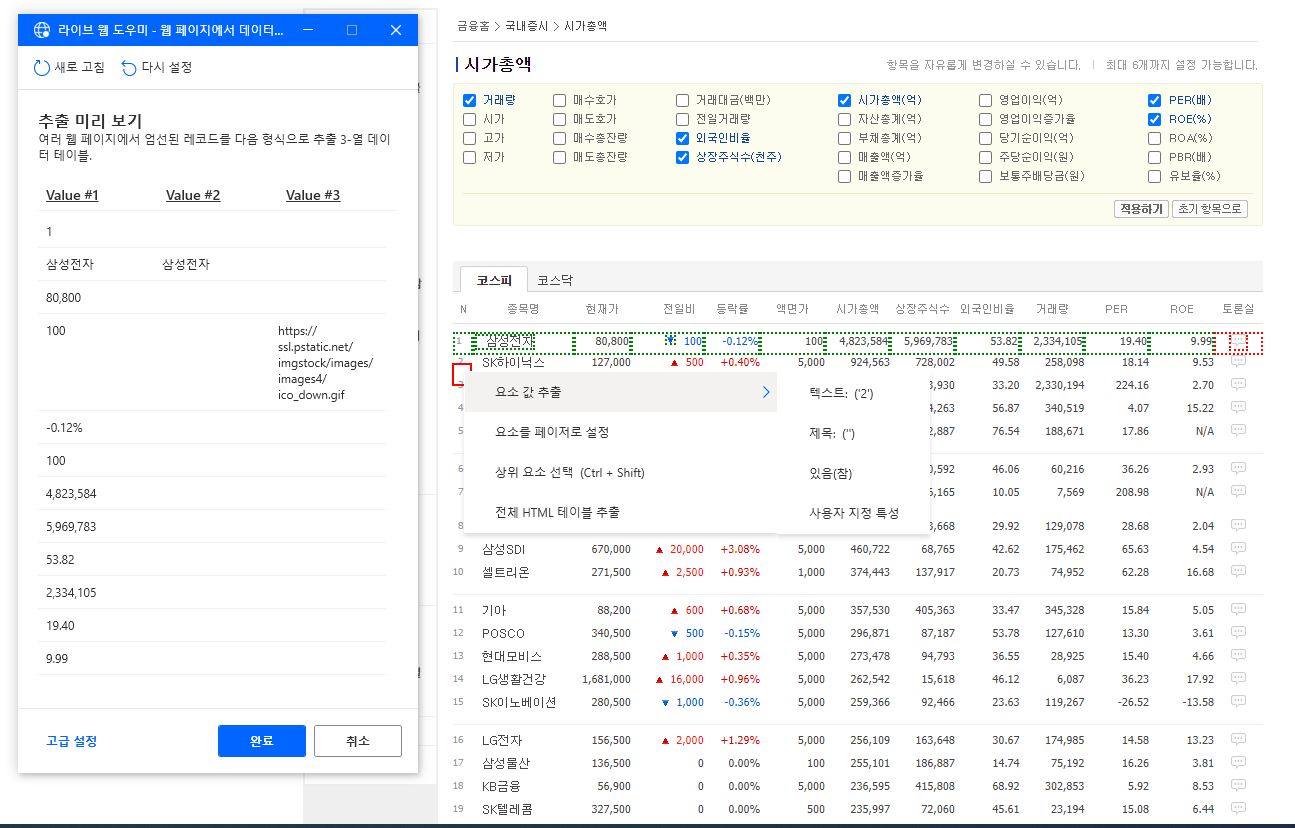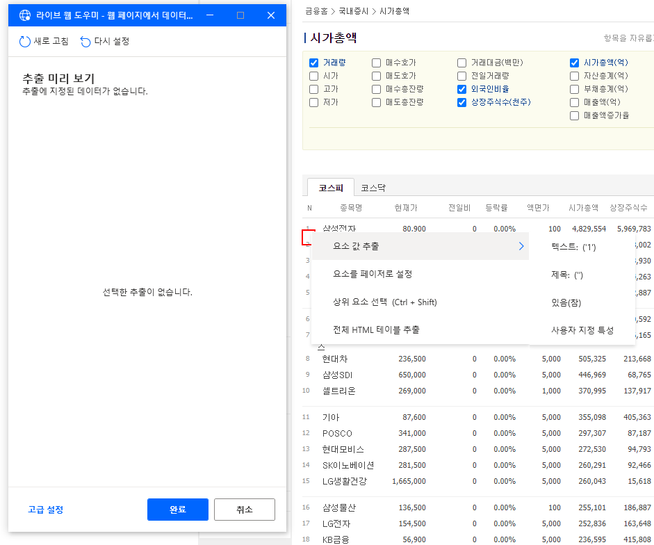이 상태에서 시가총액 웹 페이지로 이동합니다. 그러면 라이브 웹 도우미 창이 자동으로 뜨고 N의 1 부분에 커서를 가져가서 마우스 우측 버튼을 클릭, 요소 값 추출 > 텍스트:('1')을 선택합니다.