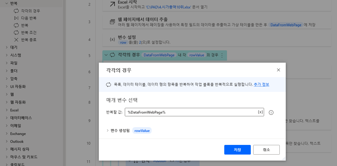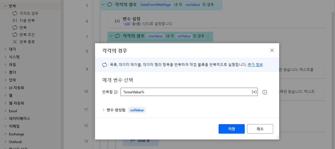 다음은 좌측 메뉴 반복 > 각각의 경우를 끌어와 변수명을 rowValue로 수정하고 저장합니다.