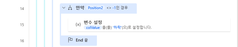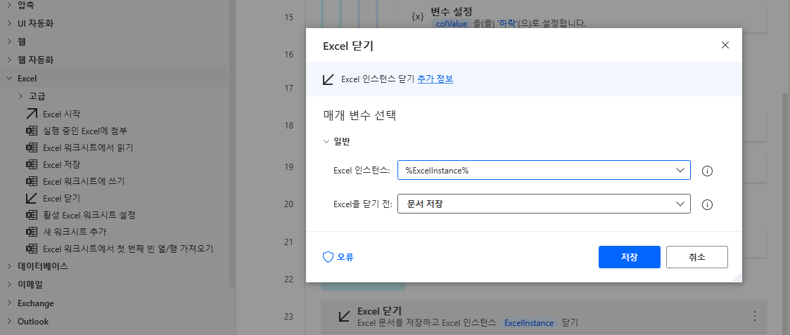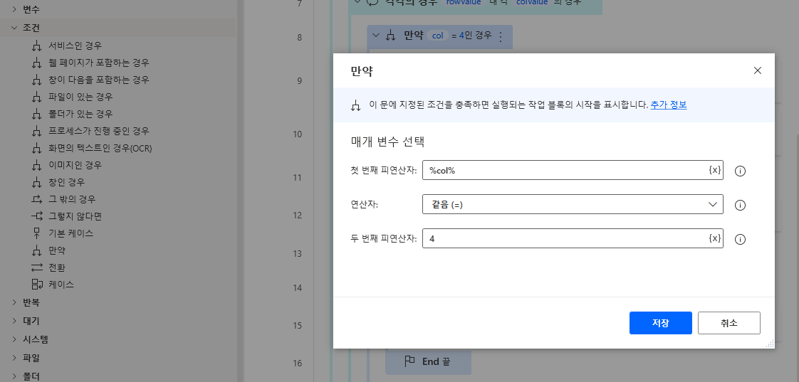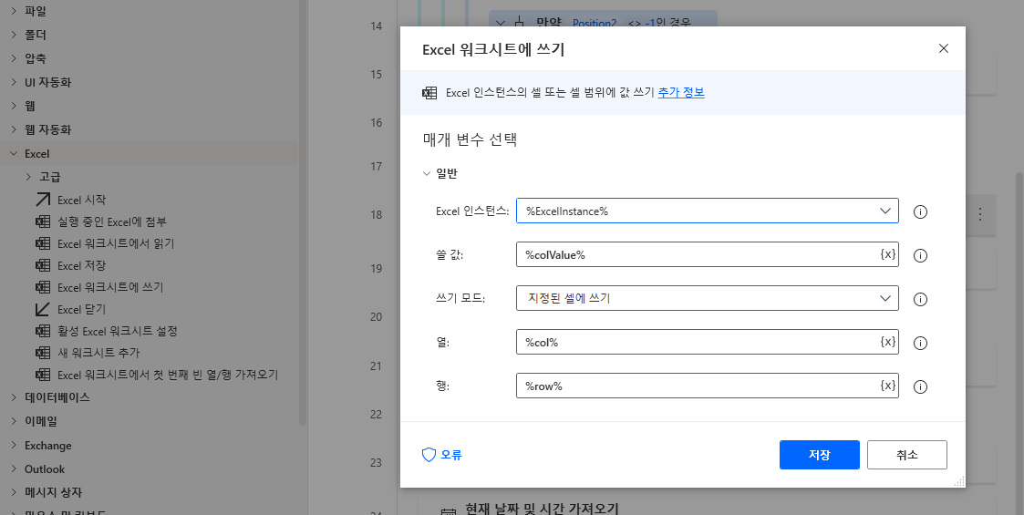이제 열 값에 대한 처리가 끝났으므로 엑셀에 값을 쓰겠습니다. 좌측 메뉴 Excel > Excel 워크시트에 쓰기를 끌어와 쓸 변수명은 colValue, 열과 행은 col과 row를 입력하고 저장합니다.